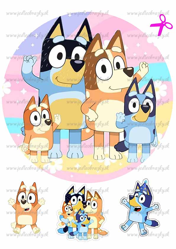 Originálna jedlá dekorácia na tortu s celou rodinou Bluey na jemnom pastelovom pozadí. Univerzálny motív vhodný pre chlapcov aj dievčatá.