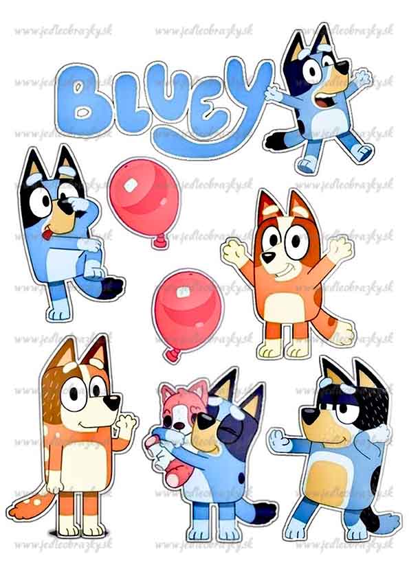 ✓ Obsah balenia: obrázok vo formáte A4 – viacero postavičiek na vystrihnutie + nápis Bluey a balóniky pre originálne dekorovanie torty.