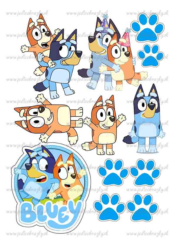 ✓ Obsah balenia: obrázok vo formáte A4 – postavičky Bluey v rôznych pózach, modré labky a nápis Bluey na vystrihnutie a dekoráciu torty či muffinov.