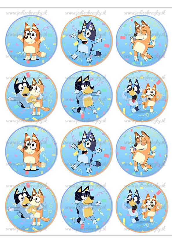 Veselé jedlé obrázky s Bluey a jej rodinou v rôznych pózach – ideálne na muffiny, cupcakes alebo menšie tortičky. Každý obrázok má priemer cca 6 cm.