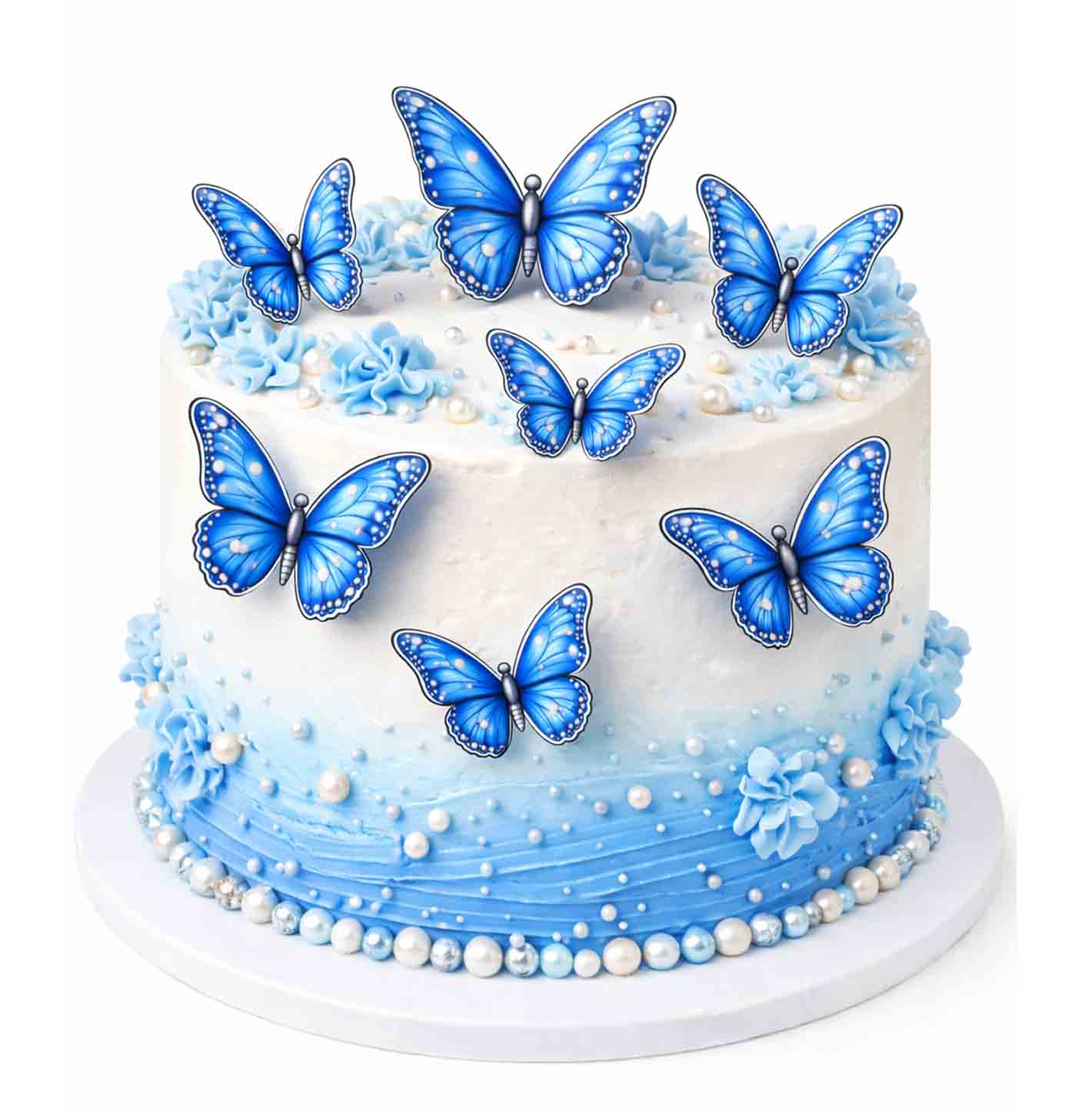 Elegantné modré jedlé motýle sú jemná a efektná dekorácia na tortu, cupcakes alebo dezerty. Motýle sú vyrezané z jedlej oblátky a pripravené na okamžité použitie.